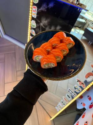 Шикарный суши-ресторан! Смотрите на фото 😍 это мой ролл на тарелке. «Филадельфия» просто огромная, кусок рыбы толстенный, жирный, тает во рту. И всё свежайшее ! Нежнейшее! Я в полнейшем восторге от вкуса и подачи: красиво, аппетитно, как картинка.